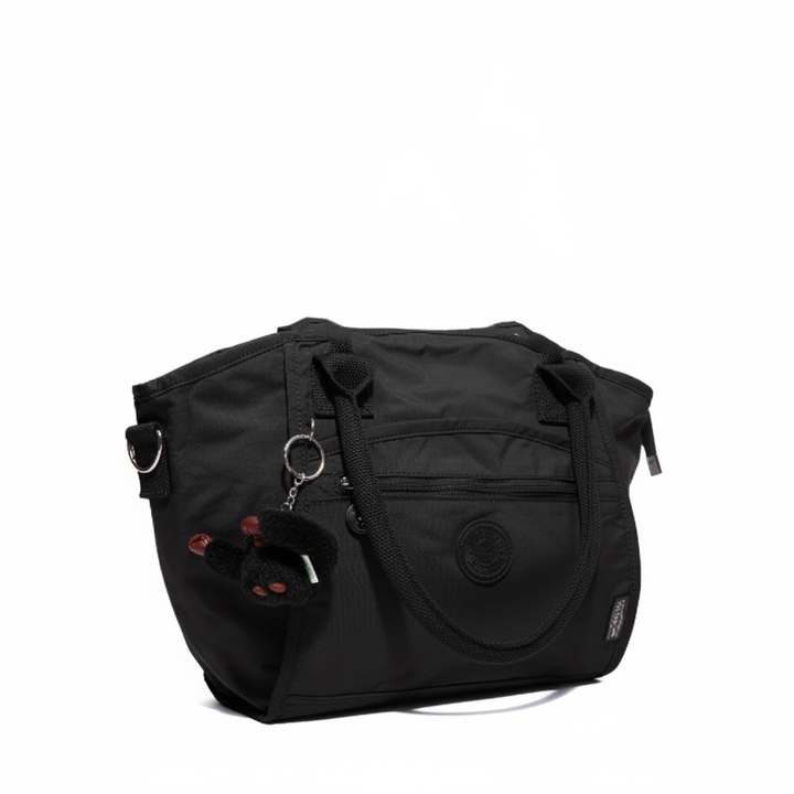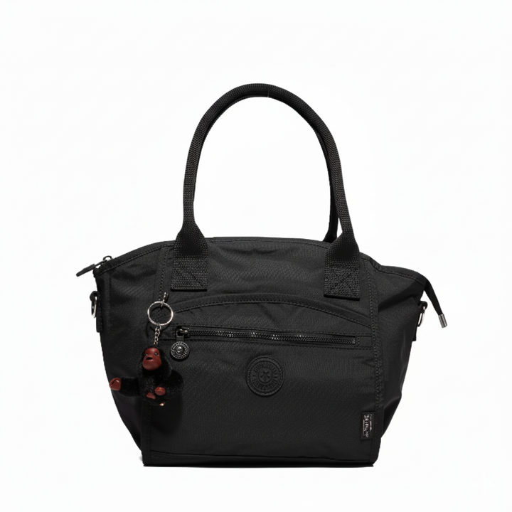 Stylish Kipling tote bag with a practical design, featuring a top zipper, front pocket, and signature monkey keychain. Lightweight and durable nylon fabric perfect for daily use.