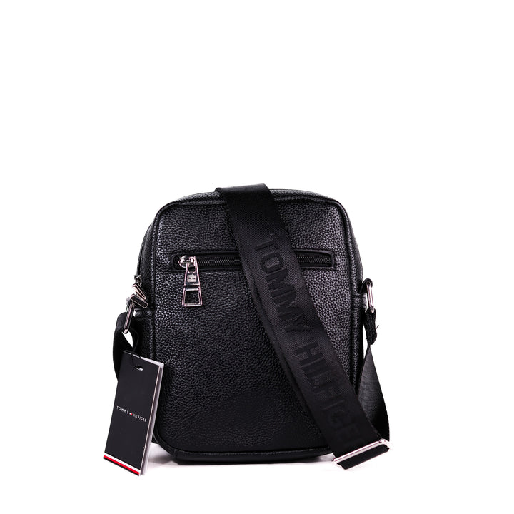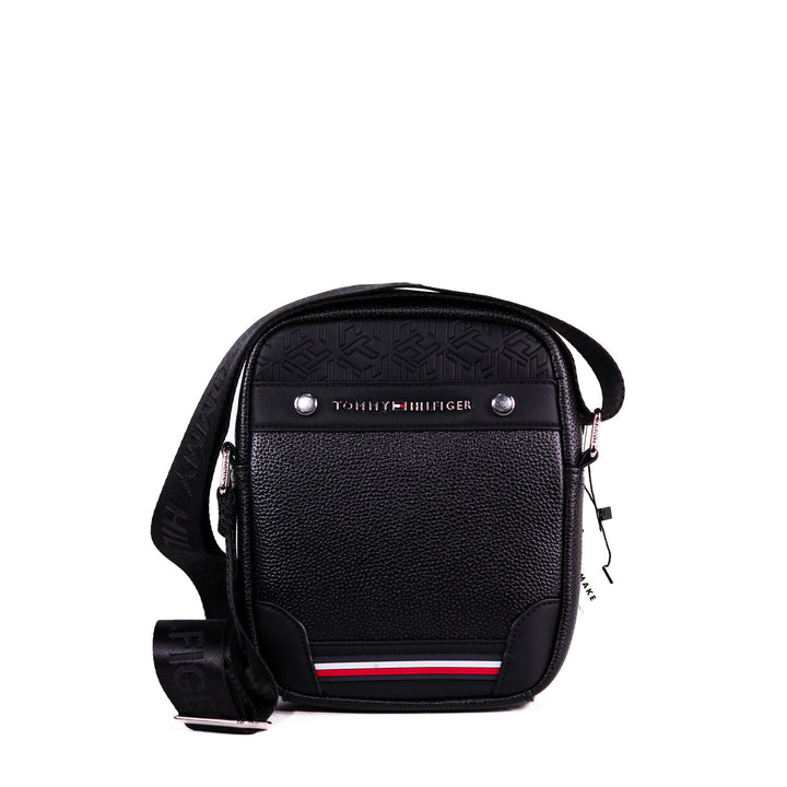 حقيبة كروس بودي من تومي هيلفيغر بتصميم أنيق لشعار العلم. الأبعاد التقديرية: ٢٠ سم (ارتفاع) × ١٧ سم (عرض) × ٦ سم (عمق).