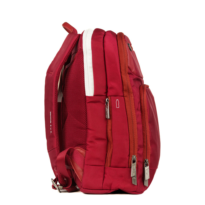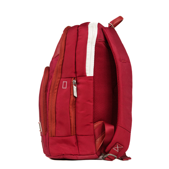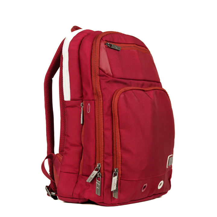 حقيبة ظهر حمراء جذابة للكمبيوتر المحمول، مزودة بحجرات تخزين متعددة لتنظيم مثالي. تتميز بتصميم متين وخياطة معززة وجيوب متعددة بسحاب.
