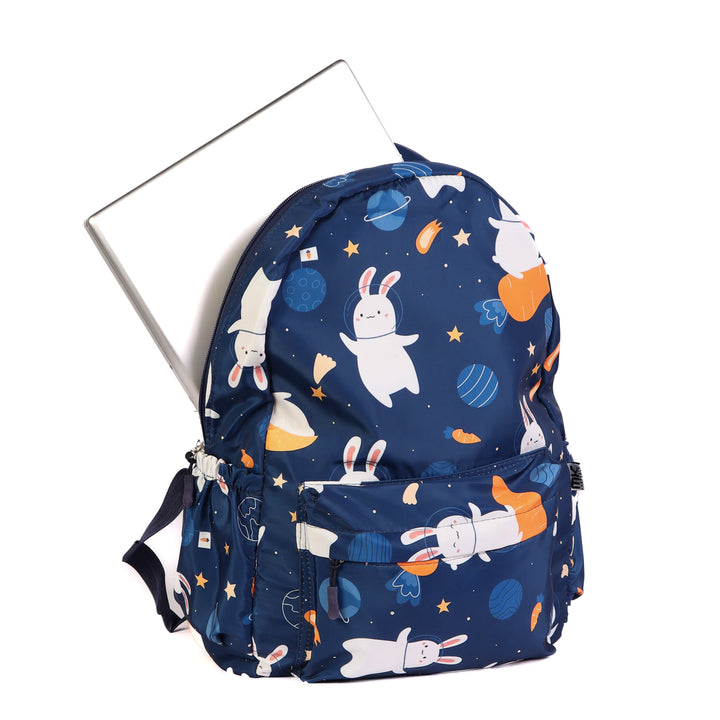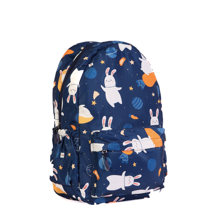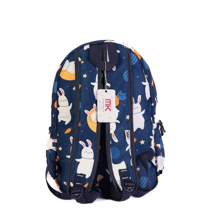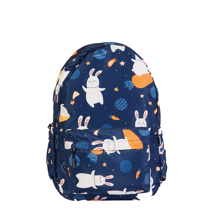 Durable nylon backpack with a playful print. Ideal for school, travel, or everyday use. Spacious main compartment and easy-access front pocket. Approximate size: 46x33x17 cm.
