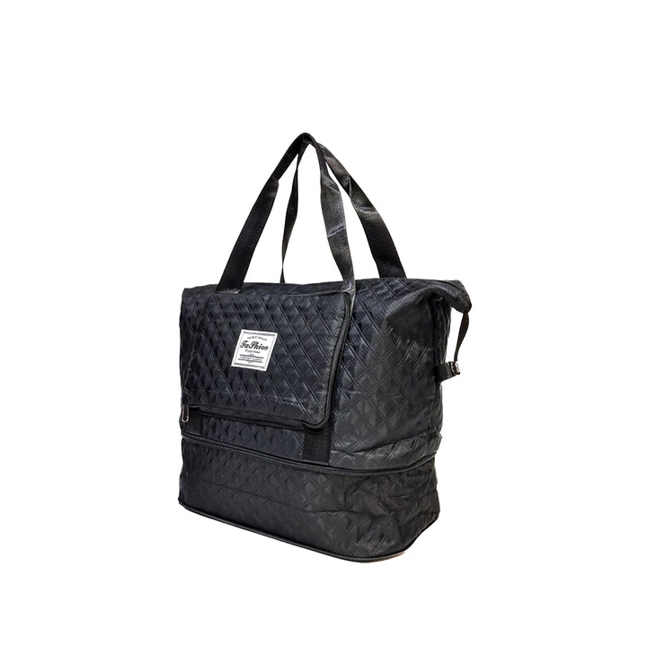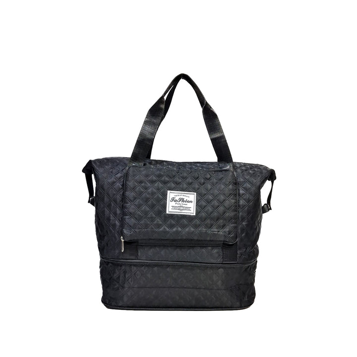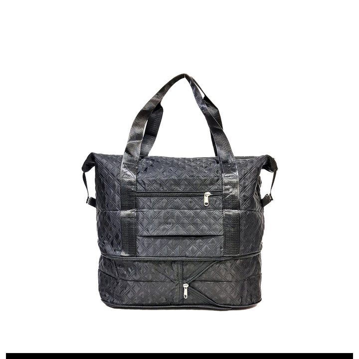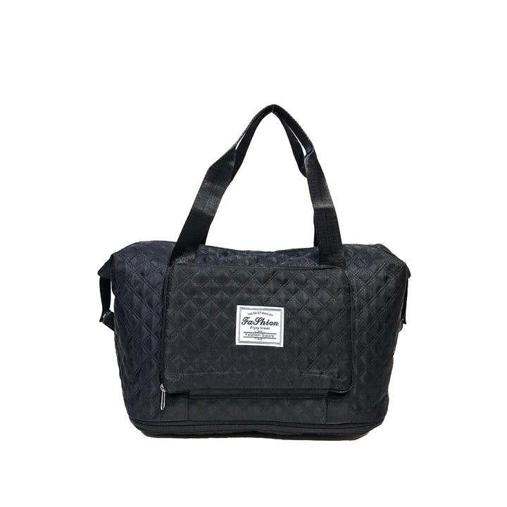 Classic black quilted travel bag with expandable bottom section. The back view shows the bag fully extended for maximum storage.