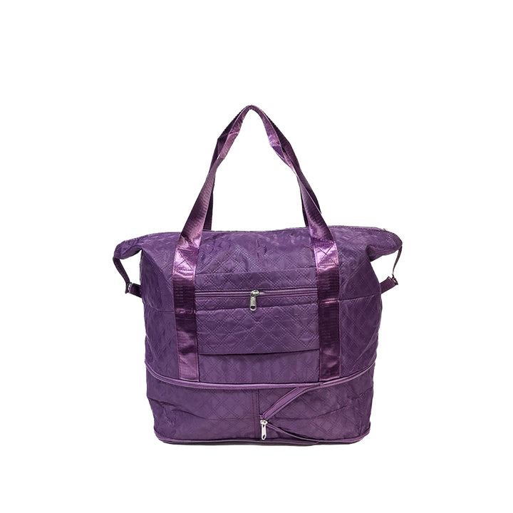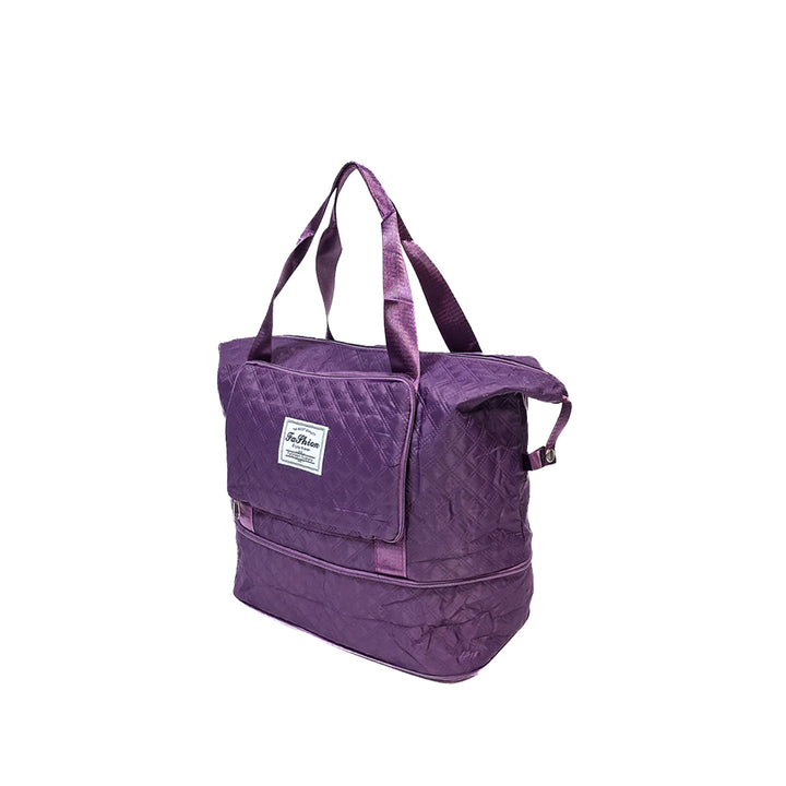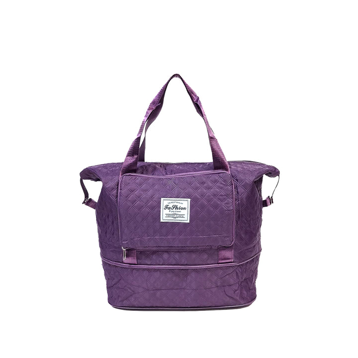 Deep purple quilted travel bag with a soft, water-resistant finish. Designed with an expandable bottom section to create extra capacity on demand.
