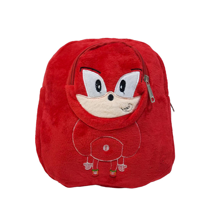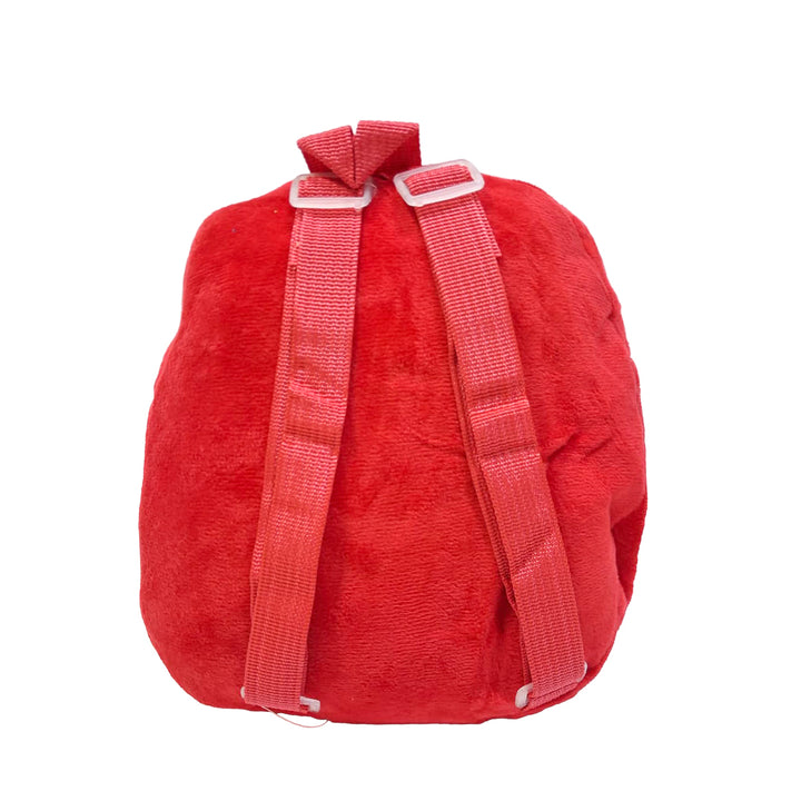 Fun red hero plush backpack with cute embroidered character on the front, sized just right for young children. Approximate dimensions: 26 x 22 x 10 cm. Perfect size for nursery, kindergarten, or short outings.