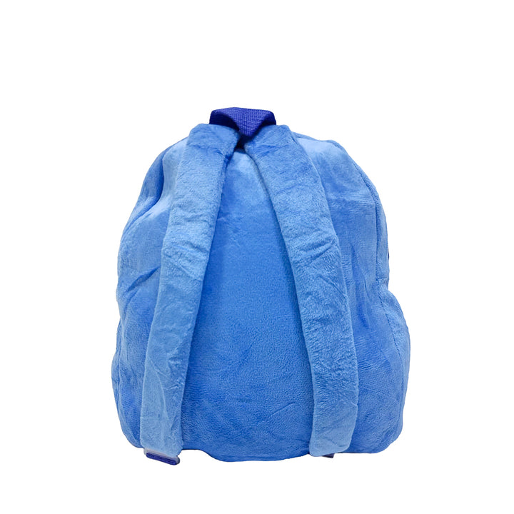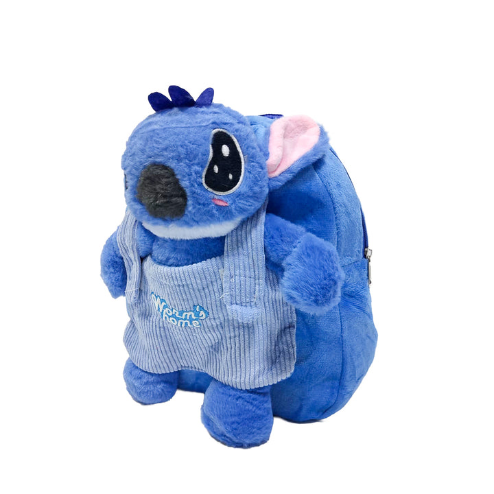 Adorable Stitch-style plush backpack with 3D doll wearing overalls, great for cuddling and carrying essentials. Approximate dimensions: 26 x 22 x 10 cm. Perfect size for nursery, kindergarten, or short outings.