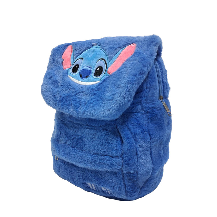 Fluffy Stitch-style plush backpack with large flap and smiling face, great for carrying lightweight school or travel items. Approximate dimensions: 28 x 24 x 10 cm. Perfect size for nursery, kindergarten, or short outings.