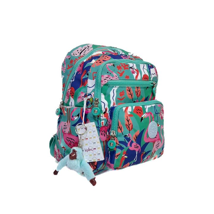 Vibrant Kipling backpack with a flamingo tropical print. Includes spacious compartments, padded straps, and durable nylon fabric. Perfect for casual outings or daily use. Estimated size: 32 x 25 x 14 cm.