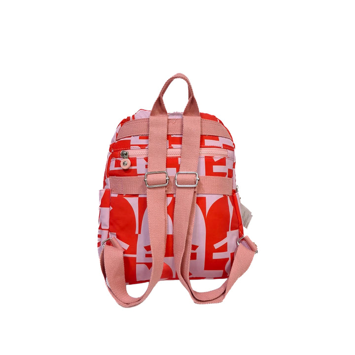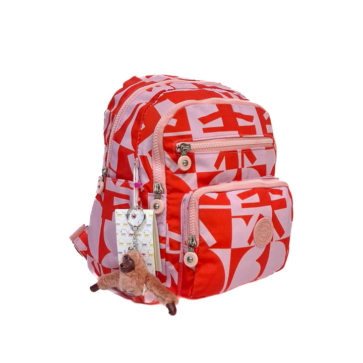 Eye-catching Kipling backpack with bold red and pink geometric print. Features multiple compartments, strong zippers, and adjustable straps. Ideal for school, work, or short trips. Estimated size: 32 x 25 x 14 cm.