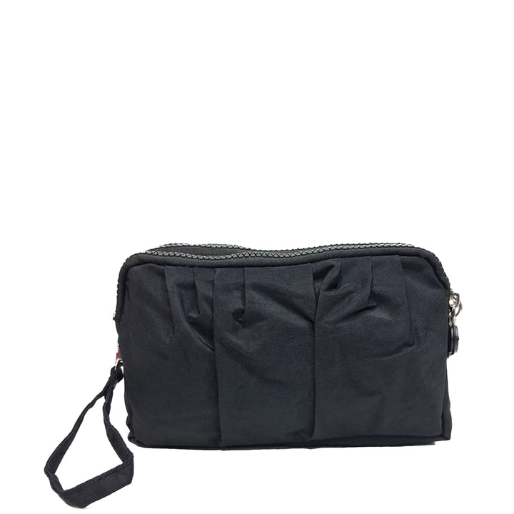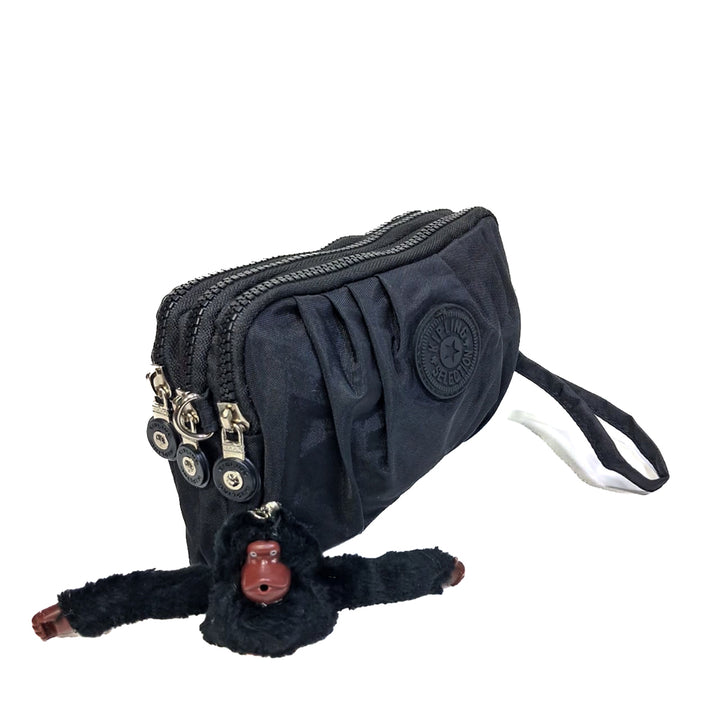 Everyday pleated nylon crossbody bag featuring triple zip compartments and a signature monkey charm, perfect for daily errands and travel.