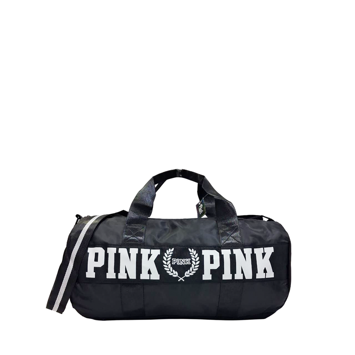 Trendy PINK duffel featuring logo straps and multiple pockets—lightweight, durable, and easy to carry.