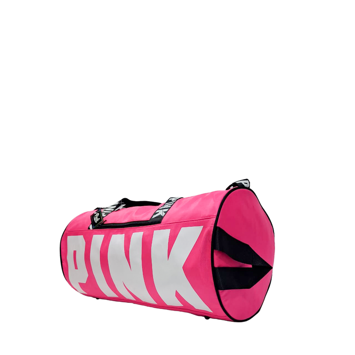 Stylish PINK duffel featuring oversized logo panels, detachable shoulder strap, and roomy interior for daily workouts and getaways.