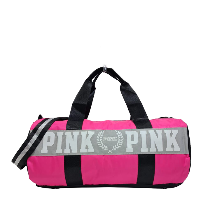 PINK duffel with contrasting grey band and laurel logo, comfortable handles, and secure zip pocket—perfect for fitness and travel.