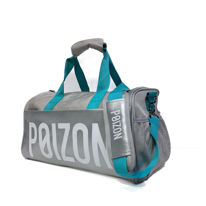 Modern POIZON sports duffel bag with padded handles and durable construction. Approximate dimensions: 48 x 27 x 23 cm. Ideal for gym sessions, sports, and weekend travel.