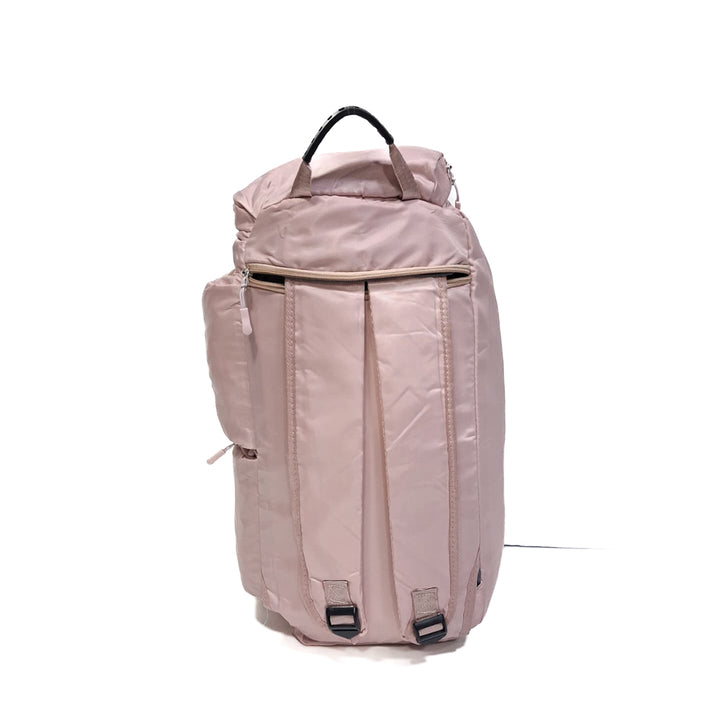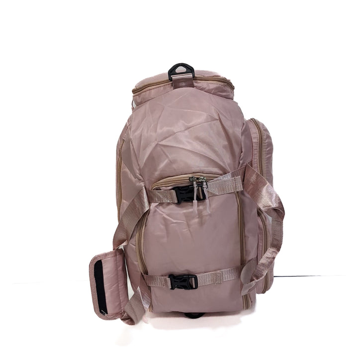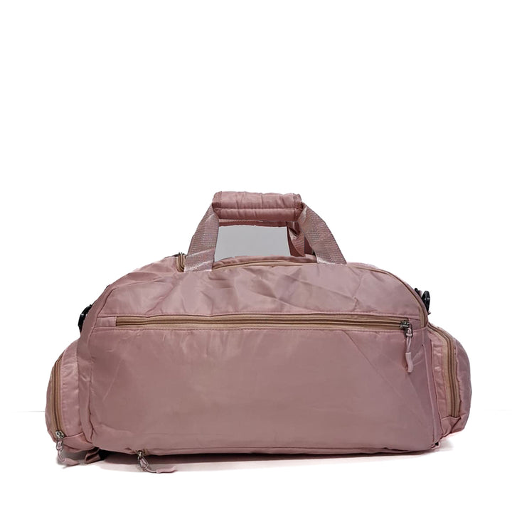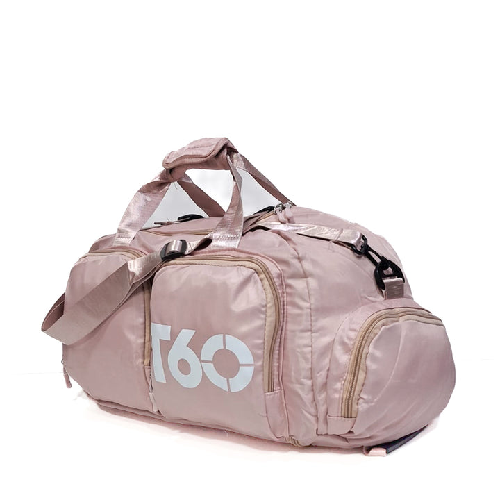 Pink T60 duffel gym bag with multi-compartment storage and backpack straps. Approximate dimensions: 52 x 28 x 25 cm. Ideal for gym sessions, sports, and weekend travel.